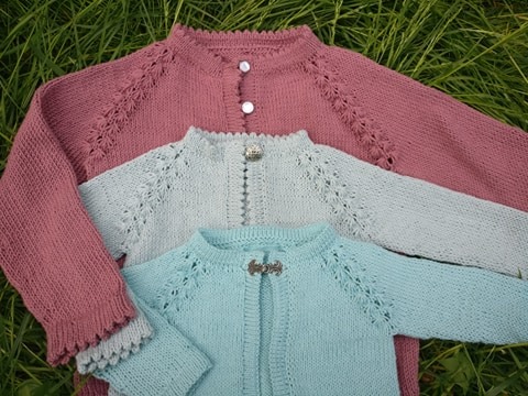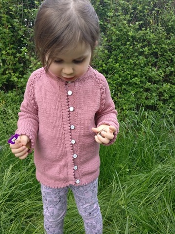 Den er helt enkelt med de sødeste og dekorative raglan udtagninger, samt med et lidt anderledes knappestykke, og så strikkes den oppefra og ned.