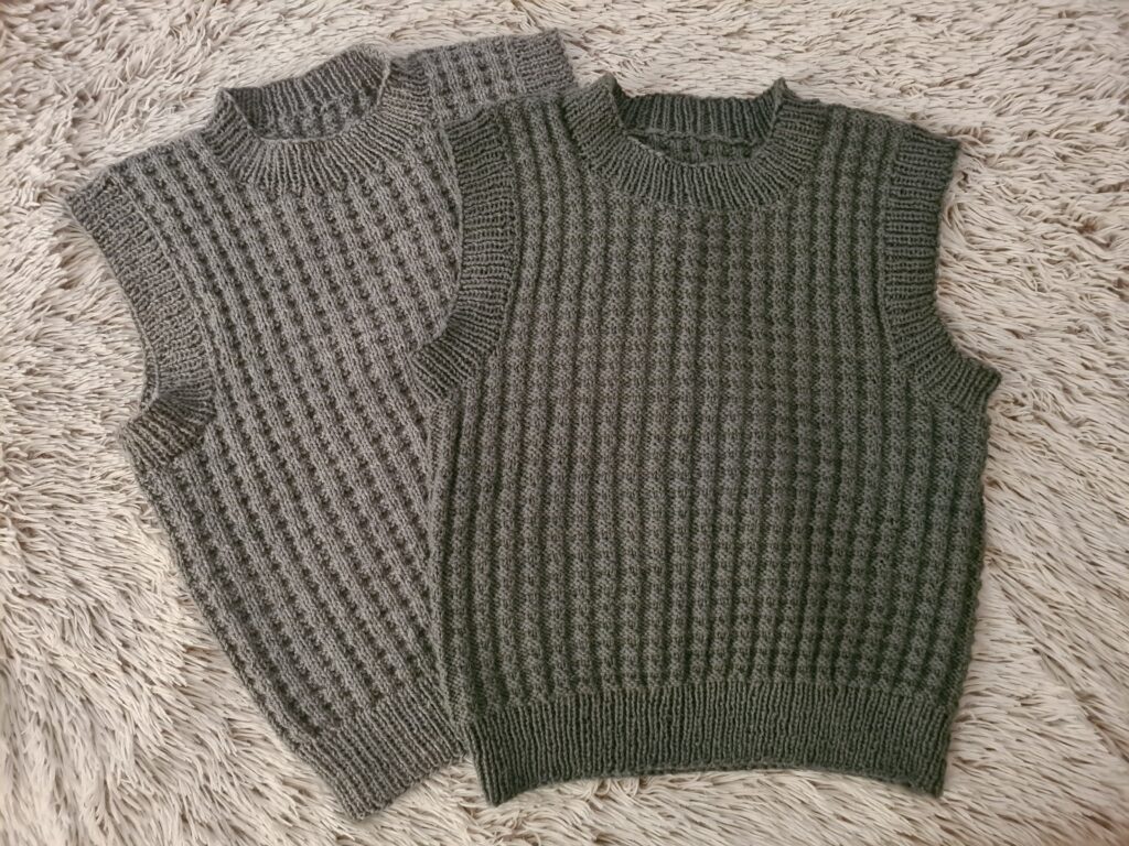 Den kan selvfølgelig også strikkes i 2 versioner lige som vesten til børn og elefanthuen, og er perfekt til foråret sammen med en fin skjorte.