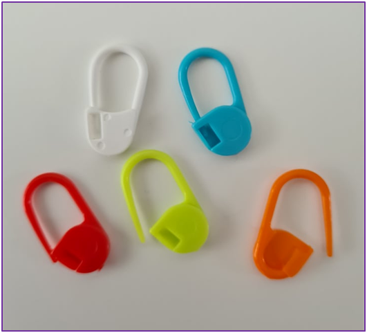 Maskemarkører kan købes hos garnbutikker, online, og kan også laves selv. Selv har jeg både hjemmelavede markører og tonsvis af åbne plastikmarkører med lås – de er utrolig nok altid væk når man skal bruge dem – så køb/lav mere end du tror du får brug for – du vil altid komme at mangle alligevel (her har jeg en datter og en kat som gør alt for at snuppe dem fra mig).