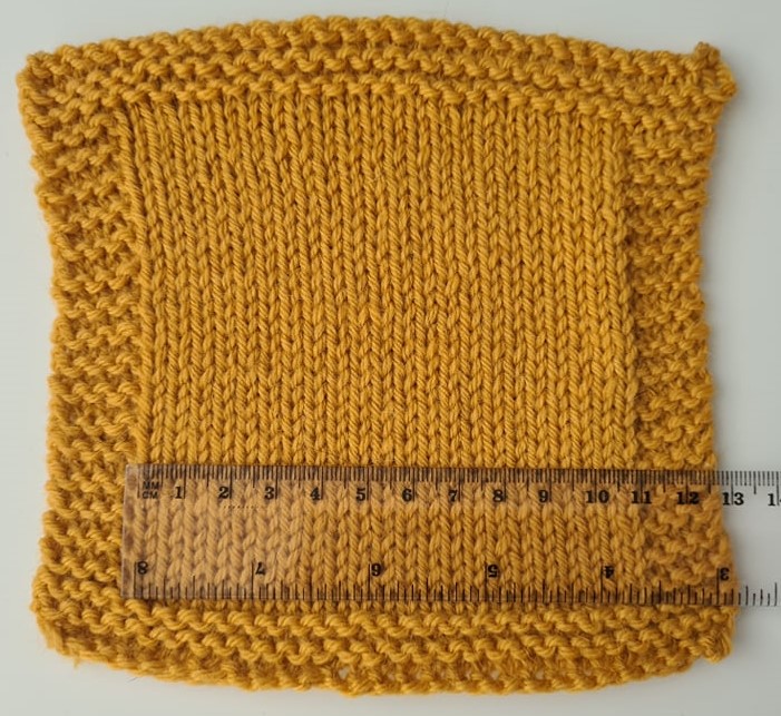 Læg så prøven fladt ned, evt. hold den nede med knappenåle, eller stryg/damp den, og tæl hvor mange masker der er i bredden og hvor mange pinde der er i højden – så har du din strikkefasthed. Husk ikke at hive for meget i prøven. Jeg bruger oftest mit sømometer, da den måler præcis 10 cm i bredden, men der fået strikkefastheds målere til garn. En almindelig lineal er også fin at anvende. Du skal aflæse antal masker i bredden og antal masker (=pinde/omgange) i højden for din strikkefasthed.