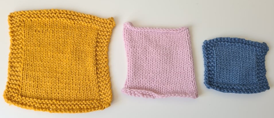 Start med at slå 8-10masker mere op end hvad opskriften/banderollen oplyser. Strik så først 3-4 pinde i retstrik for at få en kant som ikke ruller (strik ret på begge sider, så får du riller). Derefter strikker du glatstrik, men strik fortsat retstrik på de yderste 3-4masker, så ruller denne kant heller ikke. Strik så til prøven måler lidt mere end 10 cm x 10 cm i midten (glatstrik delen), og strik igen 3-4 pinde glatstrik for at afslutte med en kant magen til den i starten.